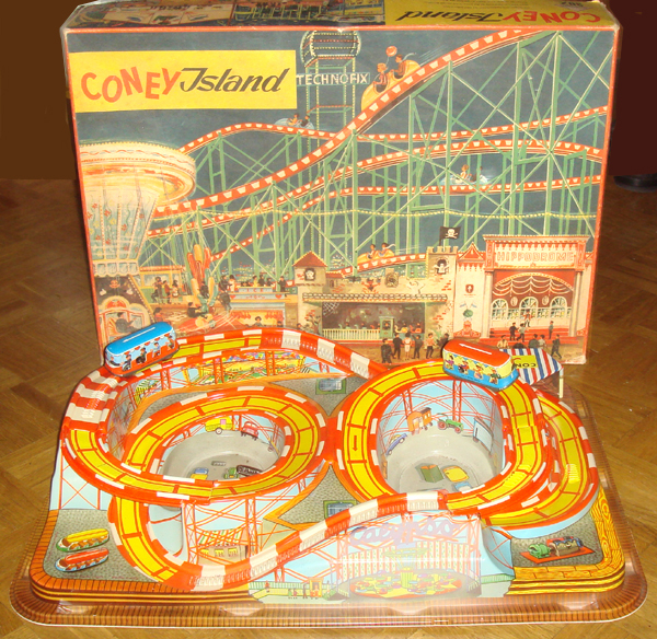 ORIGINAL TECHNOFIX 307 Coney Island Achterbahn 2 Uhrwerkautos funktionsfähig, originale Technofix Schlüssel TOP Zustand mit Originalkarton |